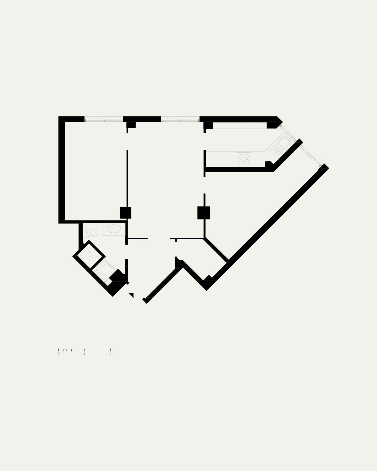 Este núcleo alberga almacenaje, lavandería e instalaciones, además resuelve los quiebros del chaflán y libera el resto de la planta.